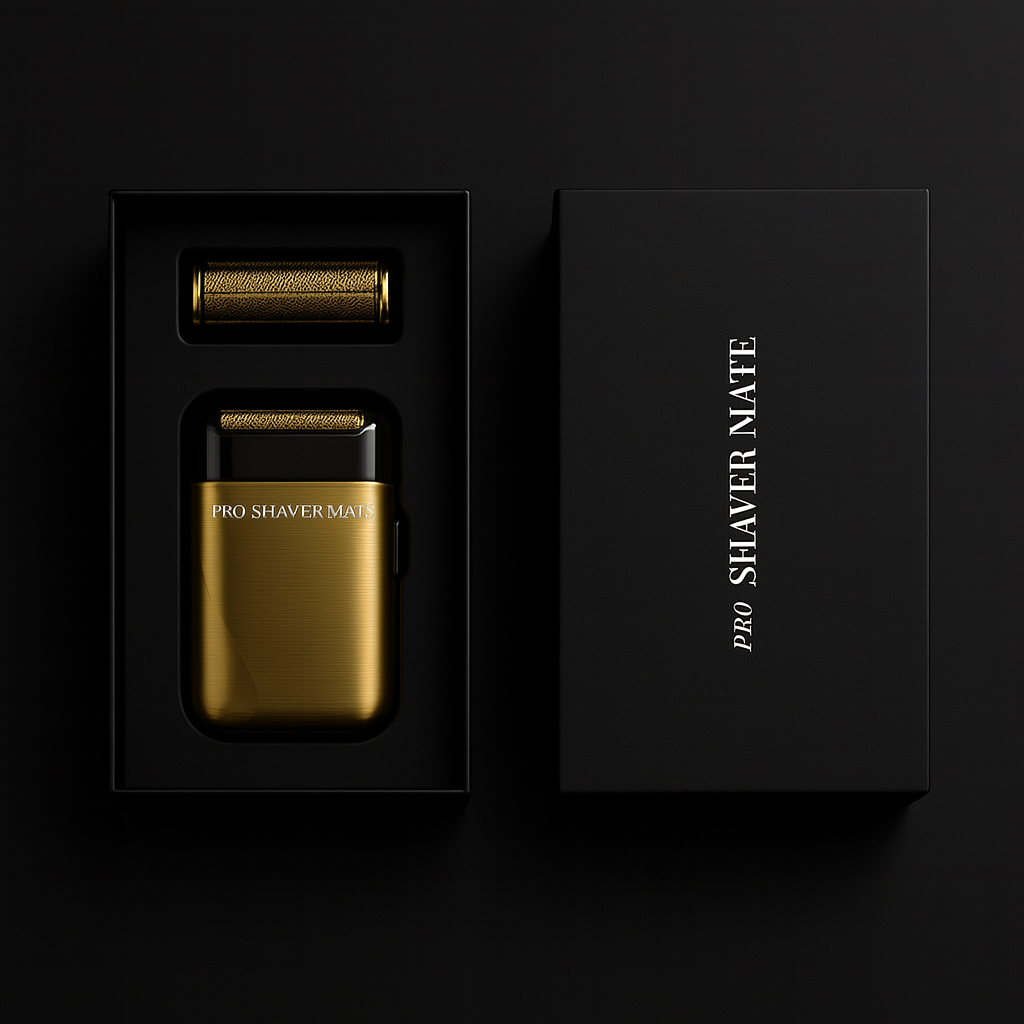Unbox elegance. Each Pro Shaver Mate arrives in a sleek black gift box with custom-fit packaging, designed to protect and present your shaver in style. Inside, you’ll find the gold-finished shaver, titanium foil head, and accessories — all crafted for performance and sophistication.